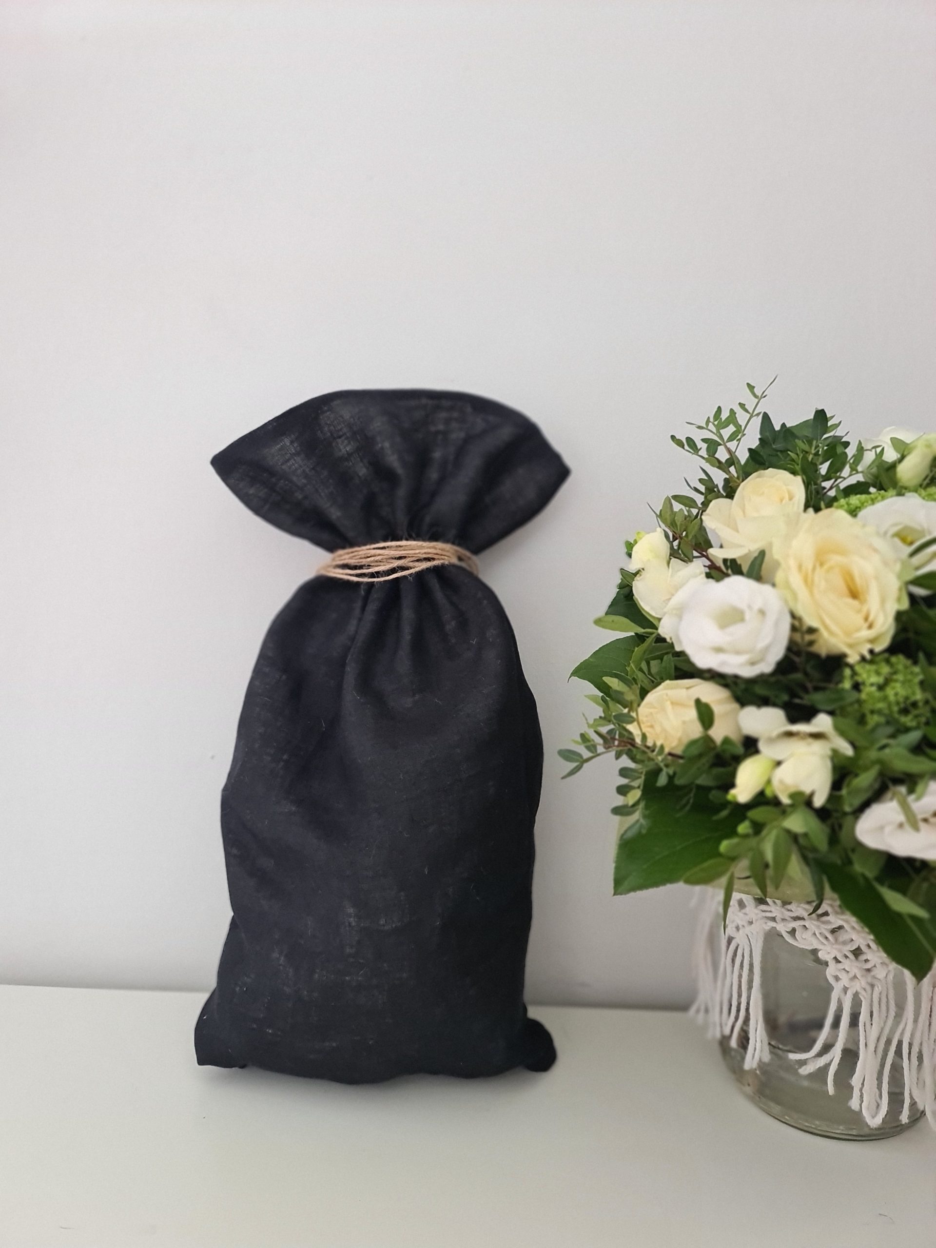 Kaunis ja pehmeä uurna, jossa ulkokangas laadukasta mustaa pellavaa ja sisävuori valkoista puuvillaa. Laskunaruna juuttinauha.